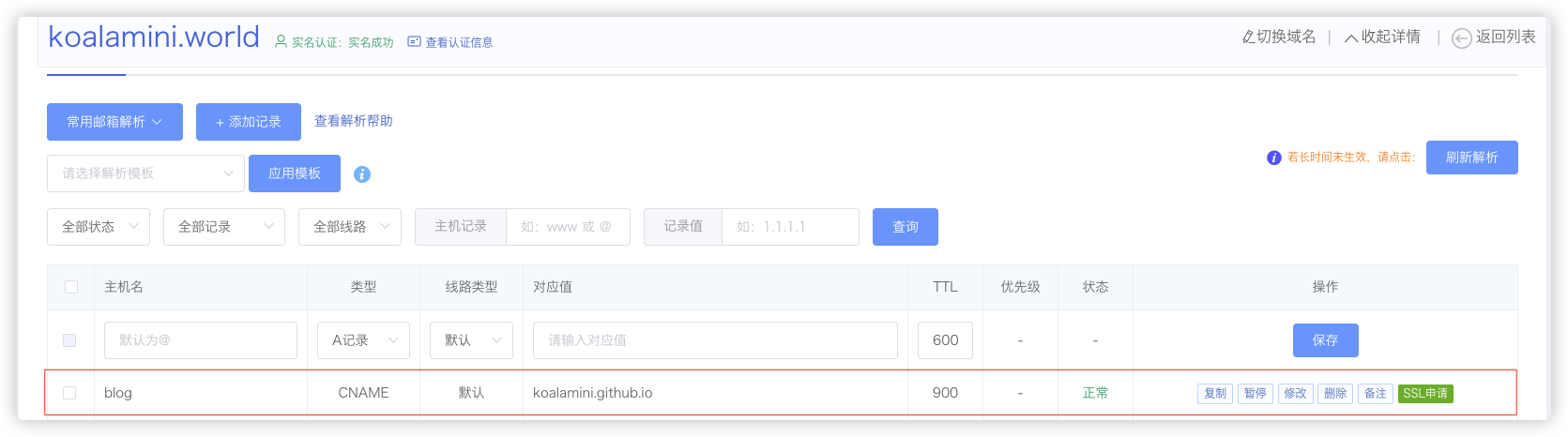 博客搭建6-自定义域名 发表于 2024-04-27 分类于 技术记录 Waline: 阅读次数: 使用blog.koalamini.world作为博客的域名 域名解析添加CNAME解析,主机名填blog 博客配置在/source路径下添加CNAME文件,注意没有文件拓展名,然后在里面添加blog.koalamini.world 最后,hexo g后部署到 github 更新日志 20240427:初稿