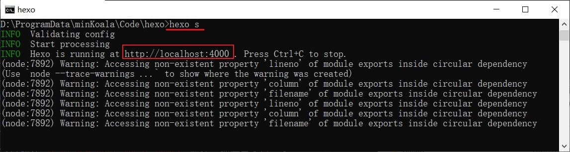hexo server本地打开博客网站,浏览器打开http://localhost:4000,缩写为hexo s